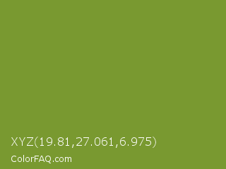 XYZ 19.81,27.061,6.975 Color is a normal lime color and the nearest color is Wasabi #788a25. Hex code #799930 and RGB value is rgb(121,153,48). In RGB color space, this color is composed of 47% red, 60% green, 19% blue, In CMYK color space, this color is composed of 21% cyan, 0% magenta, 69% yellow , 40% black , In HSL color space, this color has a hue angle of 78° , 52% saturation and 39% lightness.