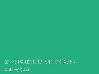 XYZ 19.823,32.541,24.975 Color is a normal green color and the nearest color is Green Crayola #1cac78. Hex code #24af7e and RGB value is rgb(36,175,126). In RGB color space, this color is composed of 14% red, 69% green, 49% blue, In CMYK color space, this color is composed of 79% cyan, 0% magenta, 28% yellow , 31% black , In HSL color space, this color has a hue angle of 159° , 66% saturation and 41% lightness.
