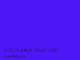 XYZ 19.848,8.783,87.035 Color is a normal indigo color and the nearest color is Han Purple #5218fa. Hex code #4d17f5 and RGB value is rgb(77,23,245). In RGB color space, this color is composed of 30% red, 9% green, 96% blue, In CMYK color space, this color is composed of 69% cyan, 91% magenta, 0% yellow , 4% black , In HSL color space, this color has a hue angle of 255° , 92% saturation and 53% lightness.