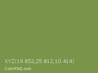 XYZ 19.852,25.812,10.414 Color is a normal green color and the nearest color is Palm Leaf #6f9940. Hex code #7a944a and RGB value is rgb(122,148,74). In RGB color space, this color is composed of 48% red, 58% green, 29% blue, In CMYK color space, this color is composed of 18% cyan, 0% magenta, 50% yellow , 42% black , In HSL color space, this color has a hue angle of 81° , 33% saturation and 44% lightness.