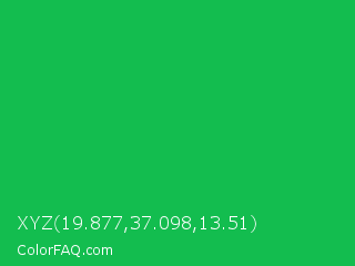 XYZ 19.877,37.098,13.51 Color is a normal green color and the nearest color is Dark Pastel Green #03c03c. Hex code #13bd4f and RGB value is rgb(19,189,79). In RGB color space, this color is composed of 7% red, 74% green, 31% blue, In CMYK color space, this color is composed of 90% cyan, 0% magenta, 58% yellow , 26% black , In HSL color space, this color has a hue angle of 141° , 82% saturation and 41% lightness.