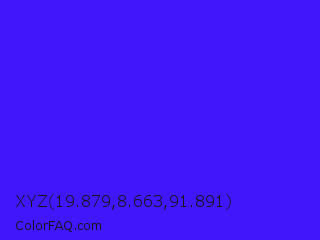 XYZ 19.879,8.663,91.891 Color is a normal indigo color and the nearest color is Han Purple #5218fa. Hex code #4116fb and RGB value is rgb(65,22,251). In RGB color space, this color is composed of 25% red, 9% green, 98% blue, In CMYK color space, this color is composed of 74% cyan, 91% magenta, 0% yellow , 2% black , In HSL color space, this color has a hue angle of 251° , 97% saturation and 54% lightness.