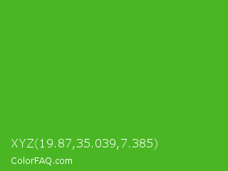 XYZ 19.87,35.039,7.385 Color is a normal green color and the nearest color is Kelly Green #4cbb17. Hex code #4ab624 and RGB value is rgb(74,182,36). In RGB color space, this color is composed of 29% red, 71% green, 14% blue, In CMYK color space, this color is composed of 59% cyan, 0% magenta, 80% yellow , 29% black , In HSL color space, this color has a hue angle of 104° , 67% saturation and 43% lightness.