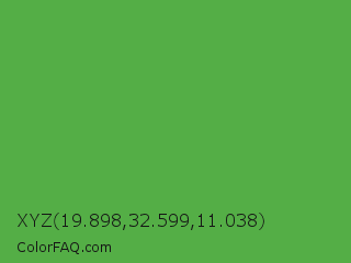 XYZ 19.898,32.599,11.038 Color is a normal green color and the nearest color is Apple #4fa83d. Hex code #54ae46 and RGB value is rgb(84,174,70). In RGB color space, this color is composed of 33% red, 68% green, 27% blue, In CMYK color space, this color is composed of 52% cyan, 0% magenta, 60% yellow , 32% black , In HSL color space, this color has a hue angle of 112° , 43% saturation and 48% lightness.