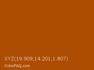 XYZ 19.909,14.201,1.807 Color is a normal orange color and the nearest color is Rich Gold #a85307. Hex code #ad4d04 and RGB value is rgb(173,77,4). In RGB color space, this color is composed of 68% red, 30% green, 2% blue, In CMYK color space, this color is composed of 0% cyan, 55% magenta, 98% yellow , 32% black , In HSL color space, this color has a hue angle of 26° , 95% saturation and 35% lightness.
