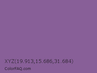 XYZ 19.913,15.686,31.684 Color is a normal purple color and the nearest color is Trendy Pink #8c6495. Hex code #885f98 and RGB value is rgb(136,95,152). In RGB color space, this color is composed of 53% red, 37% green, 60% blue, In CMYK color space, this color is composed of 11% cyan, 38% magenta, 0% yellow , 40% black , In HSL color space, this color has a hue angle of 283° , 23% saturation and 48% lightness.