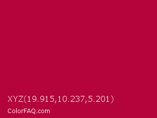 XYZ 19.915,10.237,5.201 Color is a normal rose color and the nearest color is Shiraz #b20931. Hex code #b5043c and RGB value is rgb(181,4,60). In RGB color space, this color is composed of 71% red, 2% green, 24% blue, In CMYK color space, this color is composed of 0% cyan, 98% magenta, 67% yellow , 29% black , In HSL color space, this color has a hue angle of 341° , 96% saturation and 36% lightness.