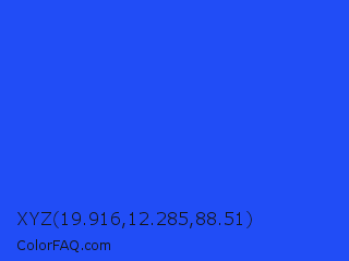 XYZ 19.916,12.285,88.51 Color is a normal blue color and the nearest color is Palatinate Blue #273be2. Hex code #214df6 and RGB value is rgb(33,77,246). In RGB color space, this color is composed of 13% red, 30% green, 96% blue, In CMYK color space, this color is composed of 87% cyan, 69% magenta, 0% yellow , 4% black , In HSL color space, this color has a hue angle of 228° , 92% saturation and 55% lightness.