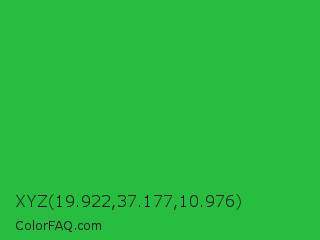 XYZ 19.922,37.177,10.976 Color is a normal green color and the nearest color is Wageningen Green #34b233. Hex code #26bd40 and RGB value is rgb(38,189,64). In RGB color space, this color is composed of 15% red, 74% green, 25% blue, In CMYK color space, this color is composed of 80% cyan, 0% magenta, 66% yellow , 26% black , In HSL color space, this color has a hue angle of 130° , 67% saturation and 45% lightness.