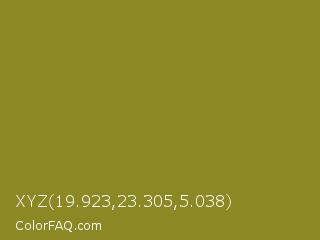 XYZ 19.923,23.305,5.038 Color is a normal yellow color and the nearest color is Hacienda #98811b. Hex code #8c8823 and RGB value is rgb(140,136,35). In RGB color space, this color is composed of 55% red, 53% green, 14% blue, In CMYK color space, this color is composed of 0% cyan, 3% magenta, 75% yellow , 45% black , In HSL color space, this color has a hue angle of 58° , 60% saturation and 34% lightness.