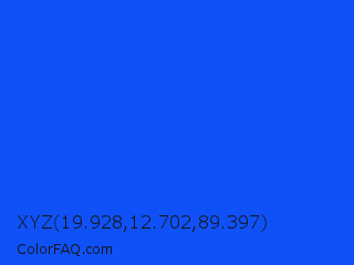 XYZ 19.928,12.702,89.397 Color is a normal blue color and the nearest color is Blue RYB #0247fe. Hex code #0f51f7 and RGB value is rgb(15,81,247). In RGB color space, this color is composed of 6% red, 32% green, 97% blue, In CMYK color space, this color is composed of 94% cyan, 67% magenta, 0% yellow , 3% black , In HSL color space, this color has a hue angle of 223° , 94% saturation and 51% lightness.