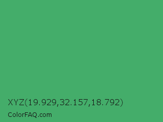 XYZ 19.929,32.157,18.792 Color is a normal green color and the nearest color is Chateau Green #40a860. Hex code #44ad6a and RGB value is rgb(68,173,106). In RGB color space, this color is composed of 27% red, 68% green, 42% blue, In CMYK color space, this color is composed of 61% cyan, 0% magenta, 39% yellow , 32% black , In HSL color space, this color has a hue angle of 142° , 44% saturation and 47% lightness.