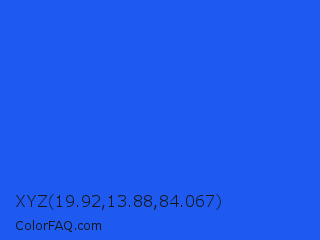 XYZ 19.92,13.88,84.067 Color is a normal blue color and the nearest color is Blue Crayola #1f75fe. Hex code #1e5af0 and RGB value is rgb(30,90,240). In RGB color space, this color is composed of 12% red, 35% green, 94% blue, In CMYK color space, this color is composed of 88% cyan, 63% magenta, 0% yellow , 6% black , In HSL color space, this color has a hue angle of 223° , 88% saturation and 53% lightness.