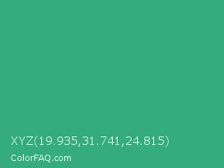 XYZ 19.935,31.741,24.815 Color is a normal green color and the nearest color is Jungle Green #29ab87. Hex code #34ac7e and RGB value is rgb(52,172,126). In RGB color space, this color is composed of 20% red, 67% green, 49% blue, In CMYK color space, this color is composed of 70% cyan, 0% magenta, 27% yellow , 33% black , In HSL color space, this color has a hue angle of 157° , 54% saturation and 44% lightness.