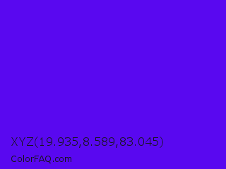 XYZ 19.935,8.589,83.045 Color is a normal violet color and the nearest color is Han Purple #5218fa. Hex code #5908f0 and RGB value is rgb(89,8,240). In RGB color space, this color is composed of 35% red, 3% green, 94% blue, In CMYK color space, this color is composed of 63% cyan, 97% magenta, 0% yellow , 6% black , In HSL color space, this color has a hue angle of 261° , 94% saturation and 49% lightness.