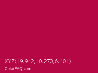 XYZ 19.942,10.273,6.401 Color is a normal rose color and the nearest color is Pictorial Carmine #c30b4e. Hex code #b40744 and RGB value is rgb(180,7,68). In RGB color space, this color is composed of 71% red, 3% green, 27% blue, In CMYK color space, this color is composed of 0% cyan, 96% magenta, 62% yellow , 29% black , In HSL color space, this color has a hue angle of 339° , 93% saturation and 37% lightness.