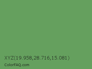 XYZ 19.958,28.716,15.081 Color is a normal green color and the nearest color is Russian Green #679267. Hex code #65a05e and RGB value is rgb(101,160,94). In RGB color space, this color is composed of 40% red, 63% green, 37% blue, In CMYK color space, this color is composed of 37% cyan, 0% magenta, 41% yellow , 37% black , In HSL color space, this color has a hue angle of 114° , 26% saturation and 50% lightness.