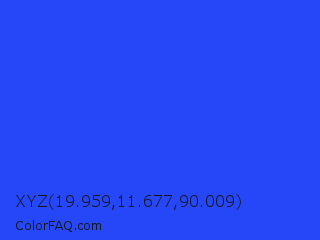 XYZ 19.959,11.677,90.009 Color is a normal blue color and the nearest color is Palatinate Blue #273be2. Hex code #2547f8 and RGB value is rgb(37,71,248). In RGB color space, this color is composed of 15% red, 28% green, 97% blue, In CMYK color space, this color is composed of 85% cyan, 71% magenta, 0% yellow , 3% black , In HSL color space, this color has a hue angle of 230° , 94% saturation and 56% lightness.