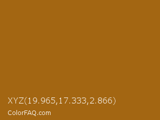 XYZ 19.965,17.333,2.866 Color is a normal orange color and the nearest color is Reno Sand #a86515. Hex code #a36612 and RGB value is rgb(163,102,18). In RGB color space, this color is composed of 64% red, 40% green, 7% blue, In CMYK color space, this color is composed of 0% cyan, 37% magenta, 89% yellow , 36% black , In HSL color space, this color has a hue angle of 35° , 80% saturation and 35% lightness.