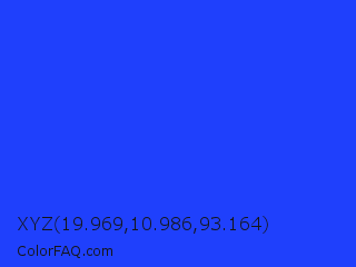 XYZ 19.969,10.986,93.164 Color is a normal blue color and the nearest color is Palatinate Blue #273be2. Hex code #1f40fc and RGB value is rgb(31,64,252). In RGB color space, this color is composed of 12% red, 25% green, 99% blue, In CMYK color space, this color is composed of 88% cyan, 75% magenta, 0% yellow , 1% black , In HSL color space, this color has a hue angle of 231° , 97% saturation and 55% lightness.