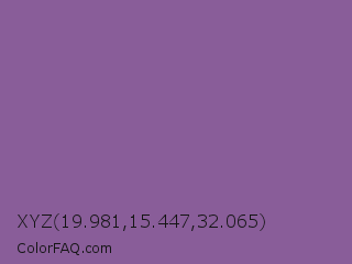 XYZ 19.981,15.447,32.065 Color is a normal purple color and the nearest color is Trendy Pink #8c6495. Hex code #895d99 and RGB value is rgb(137,93,153). In RGB color space, this color is composed of 54% red, 36% green, 60% blue, In CMYK color space, this color is composed of 10% cyan, 39% magenta, 0% yellow , 40% black , In HSL color space, this color has a hue angle of 284° , 24% saturation and 48% lightness.