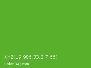 XYZ 19.986,33.3,7.66 Color is a normal green color and the nearest color is Green RYB #66b032. Hex code #58b02b and RGB value is rgb(88,176,43). In RGB color space, this color is composed of 35% red, 69% green, 17% blue, In CMYK color space, this color is composed of 50% cyan, 0% magenta, 76% yellow , 31% black , In HSL color space, this color has a hue angle of 100° , 61% saturation and 43% lightness.