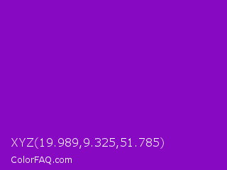 XYZ 19.989,9.325,51.785 Color is a normal purple color and the nearest color is French Violet #8806ce. Hex code #8809c2 and RGB value is rgb(136,9,194). In RGB color space, this color is composed of 53% red, 4% green, 76% blue, In CMYK color space, this color is composed of 30% cyan, 95% magenta, 0% yellow , 24% black , In HSL color space, this color has a hue angle of 281° , 91% saturation and 40% lightness.