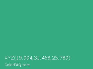 XYZ 19.994,31.468,25.789 Color is a normal green color and the nearest color is Jungle Green #29ab87. Hex code #35ab81 and RGB value is rgb(53,171,129). In RGB color space, this color is composed of 21% red, 67% green, 51% blue, In CMYK color space, this color is composed of 69% cyan, 0% magenta, 25% yellow , 33% black , In HSL color space, this color has a hue angle of 159° , 53% saturation and 44% lightness.