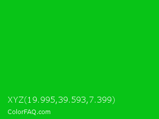 XYZ 19.995,39.593,7.399 Color is a normal green color and the nearest color is Vivid Malachite #00cc33. Hex code #08c417 and RGB value is rgb(8,196,23). In RGB color space, this color is composed of 3% red, 77% green, 9% blue, In CMYK color space, this color is composed of 96% cyan, 0% magenta, 88% yellow , 23% black , In HSL color space, this color has a hue angle of 125° , 92% saturation and 40% lightness.