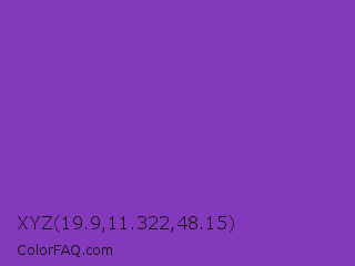 XYZ 19.9,11.322,48.15 Color is a normal purple color and the nearest color is Dark Orchid #9932cc. Hex code #8438bb and RGB value is rgb(132,56,187). In RGB color space, this color is composed of 52% red, 22% green, 73% blue, In CMYK color space, this color is composed of 29% cyan, 70% magenta, 0% yellow , 27% black , In HSL color space, this color has a hue angle of 275° , 54% saturation and 48% lightness.