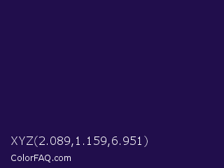 XYZ 2.089,1.159,6.951 Color is a very dark indigo color and the nearest color is Violet #240a40. Hex code #210e4c and RGB value is rgb(33,14,76). In RGB color space, this color is composed of 13% red, 5% green, 30% blue, In CMYK color space, this color is composed of 57% cyan, 82% magenta, 0% yellow , 70% black , In HSL color space, this color has a hue angle of 258° , 69% saturation and 18% lightness.