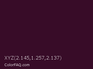 XYZ 2.145,1.257,2.137 Color is a very dark magenta color and the nearest color is Melanzane #300529. Hex code #380c28 and RGB value is rgb(56,12,40). In RGB color space, this color is composed of 22% red, 5% green, 16% blue, In CMYK color space, this color is composed of 0% cyan, 79% magenta, 29% yellow , 78% black , In HSL color space, this color has a hue angle of 322° , 65% saturation and 13% lightness.