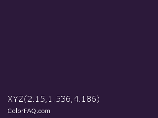 XYZ 2.15,1.536,4.186 Color is a very dark purple color and the nearest color is Dark Purple #301934. Hex code #2c193a and RGB value is rgb(44,25,58). In RGB color space, this color is composed of 17% red, 10% green, 23% blue, In CMYK color space, this color is composed of 24% cyan, 57% magenta, 0% yellow , 77% black , In HSL color space, this color has a hue angle of 275° , 40% saturation and 16% lightness.
