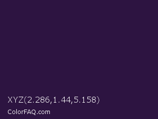 XYZ 2.286,1.44,5.158 Color is a very dark purple color and the nearest color is Valentino #350e42. Hex code #2d1441 and RGB value is rgb(45,20,65). In RGB color space, this color is composed of 18% red, 8% green, 25% blue, In CMYK color space, this color is composed of 31% cyan, 69% magenta, 0% yellow , 75% black , In HSL color space, this color has a hue angle of 273° , 53% saturation and 17% lightness.