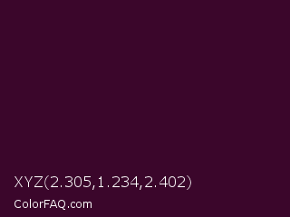 XYZ 2.305,1.234,2.402 Color is a very dark magenta color and the nearest color is Barossa #44012d. Hex code #3b062b and RGB value is rgb(59,6,43). In RGB color space, this color is composed of 23% red, 2% green, 17% blue, In CMYK color space, this color is composed of 0% cyan, 90% magenta, 27% yellow , 77% black , In HSL color space, this color has a hue angle of 318° , 82% saturation and 13% lightness.