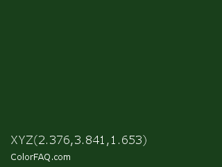 XYZ 2.376,3.841,1.653 Color is a very dark green color and the nearest color is Celtic #163222. Hex code #193f1b and RGB value is rgb(25,63,27). In RGB color space, this color is composed of 10% red, 25% green, 11% blue, In CMYK color space, this color is composed of 60% cyan, 0% magenta, 57% yellow , 75% black , In HSL color space, this color has a hue angle of 123° , 43% saturation and 17% lightness.