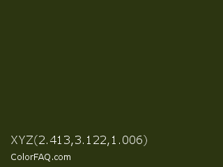 XYZ 2.413,3.122,1.006 Color is a very dark lime color and the nearest color is Turtle Green #2a380b. Hex code #2c3511 and RGB value is rgb(44,53,17). In RGB color space, this color is composed of 17% red, 21% green, 7% blue, In CMYK color space, this color is composed of 17% cyan, 0% magenta, 68% yellow , 79% black , In HSL color space, this color has a hue angle of 75° , 51% saturation and 14% lightness.