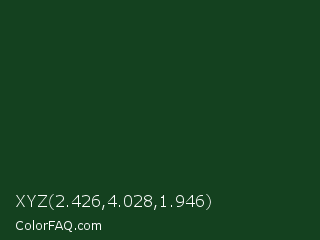 XYZ 2.426,4.028,1.946 Color is a very dark green color and the nearest color is Phthalo Green #123524. Hex code #14411f and RGB value is rgb(20,65,31). In RGB color space, this color is composed of 8% red, 25% green, 12% blue, In CMYK color space, this color is composed of 69% cyan, 0% magenta, 52% yellow , 75% black , In HSL color space, this color has a hue angle of 135° , 53% saturation and 17% lightness.