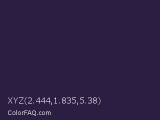 XYZ 2.444,1.835,5.38 Color is a very dark violet color and the nearest color is Ebony Clay #26283b. Hex code #2b1e42 and RGB value is rgb(43,30,66). In RGB color space, this color is composed of 17% red, 12% green, 26% blue, In CMYK color space, this color is composed of 35% cyan, 55% magenta, 0% yellow , 74% black , In HSL color space, this color has a hue angle of 262° , 38% saturation and 19% lightness.