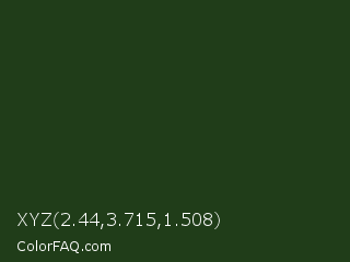 XYZ 2.44,3.715,1.508 Color is a very dark green color and the nearest color is Mallard #233418. Hex code #203d19 and RGB value is rgb(32,61,25). In RGB color space, this color is composed of 13% red, 24% green, 10% blue, In CMYK color space, this color is composed of 48% cyan, 0% magenta, 59% yellow , 76% black , In HSL color space, this color has a hue angle of 108° , 42% saturation and 17% lightness.