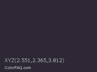 XYZ 2.551,2.365,3.812 Color is a very dark violet color and the nearest color is Charade #292937. Hex code #2e2836 and RGB value is rgb(46,40,54). In RGB color space, this color is composed of 18% red, 16% green, 21% blue, In CMYK color space, this color is composed of 15% cyan, 26% magenta, 0% yellow , 79% black , In HSL color space, this color has a hue angle of 266° , 15% saturation and 18% lightness.