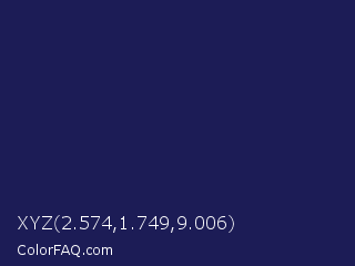 XYZ 2.574,1.749,9.006 Color is a very dark blue color and the nearest color is Port Gore #251f4f. Hex code #1c1c56 and RGB value is rgb(28,28,86). In RGB color space, this color is composed of 11% red, 11% green, 34% blue, In CMYK color space, this color is composed of 67% cyan, 67% magenta, 0% yellow , 66% black , In HSL color space, this color has a hue angle of 240° , 51% saturation and 22% lightness.
