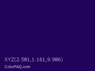 XYZ 2.581,1.161,9.986 Color is a very dark violet color and the nearest color is Cherry Pie #2a0359. Hex code #22035b and RGB value is rgb(34,3,91). In RGB color space, this color is composed of 13% red, 1% green, 36% blue, In CMYK color space, this color is composed of 63% cyan, 97% magenta, 0% yellow , 64% black , In HSL color space, this color has a hue angle of 261° , 94% saturation and 18% lightness.