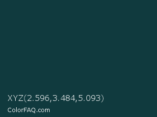 XYZ 2.596,3.484,5.093 Color is a very dark cyan color and the nearest color is Elephant #123447. Hex code #103a3e and RGB value is rgb(16,58,62). In RGB color space, this color is composed of 6% red, 23% green, 24% blue, In CMYK color space, this color is composed of 74% cyan, 6% magenta, 0% yellow , 76% black , In HSL color space, this color has a hue angle of 185° , 59% saturation and 15% lightness.