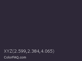 XYZ 2.599,2.384,4.065 Color is a very dark violet color and the nearest color is Blackcurrant #32293a. Hex code #2e2838 and RGB value is rgb(46,40,56). In RGB color space, this color is composed of 18% red, 16% green, 22% blue, In CMYK color space, this color is composed of 18% cyan, 29% magenta, 0% yellow , 78% black , In HSL color space, this color has a hue angle of 263° , 17% saturation and 19% lightness.
