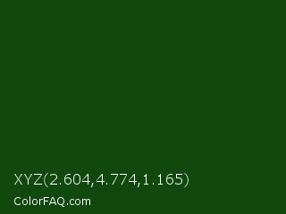 XYZ 2.604,4.774,1.165 Color is a very dark green color and the nearest color is Dark Fern #0a480d. Hex code #10480d and RGB value is rgb(16,72,13). In RGB color space, this color is composed of 6% red, 28% green, 5% blue, In CMYK color space, this color is composed of 78% cyan, 0% magenta, 82% yellow , 72% black , In HSL color space, this color has a hue angle of 117° , 69% saturation and 17% lightness.