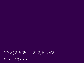 XYZ 2.635,1.212,6.752 Color is a very dark purple color and the nearest color is Valentino #350e42. Hex code #33004b and RGB value is rgb(51,0,75). In RGB color space, this color is composed of 20% red, 0% green, 29% blue, In CMYK color space, this color is composed of 32% cyan, 100% magenta, 0% yellow , 71% black , In HSL color space, this color has a hue angle of 281° , 100% saturation and 15% lightness.