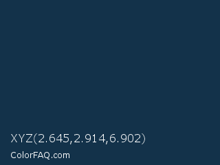 XYZ 2.645,2.914,6.902 Color is a very dark blue color and the nearest color is Elephant #123447. Hex code #13324a and RGB value is rgb(19,50,74). In RGB color space, this color is composed of 7% red, 20% green, 29% blue, In CMYK color space, this color is composed of 74% cyan, 32% magenta, 0% yellow , 71% black , In HSL color space, this color has a hue angle of 206° , 59% saturation and 18% lightness.