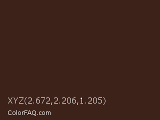 XYZ 2.672,2.206,1.205 Color is a very dark color and the nearest color is Jon #3b1f1f. Hex code #3d2219 and RGB value is rgb(61,34,25). In RGB color space, this color is composed of 24% red, 13% green, 10% blue, In CMYK color space, this color is composed of 0% cyan, 44% magenta, 59% yellow , 76% black , In HSL color space, this color has a hue angle of 15° , 42% saturation and 17% lightness.