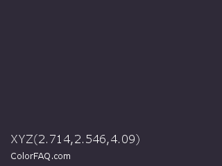 XYZ 2.714,2.546,4.09 Color is a very dark violet color and the nearest color is Blackcurrant #32293a. Hex code #2f2a38 and RGB value is rgb(47,42,56). In RGB color space, this color is composed of 18% red, 16% green, 22% blue, In CMYK color space, this color is composed of 16% cyan, 25% magenta, 0% yellow , 78% black , In HSL color space, this color has a hue angle of 261° , 14% saturation and 19% lightness.